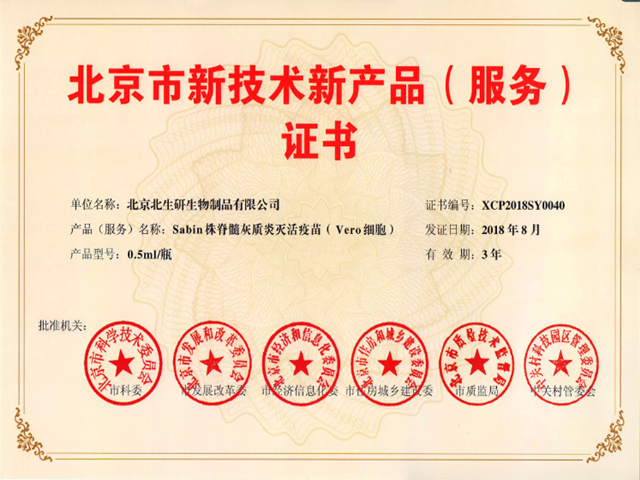 2018年9月7日,國藥中生北生研公司自主研發(fā)生產的Sabin株脊髓灰質炎滅活疫苗(Vero細胞)(sIPV疫苗)經過北京市科委、發(fā)改委、經信委等六部門評審,獲得北京市新技術新產品證書。