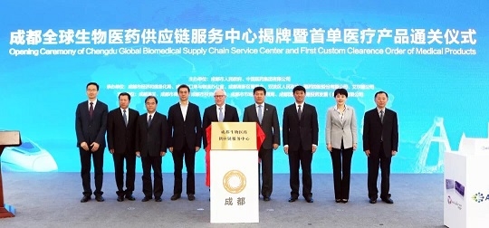 成都全球生物醫(yī)藥供應(yīng)鏈服務(wù)中心是成都立足全球打造的醫(yī)藥供應(yīng)鏈樞紐,也是構(gòu)建生物產(chǎn)業(yè)生態(tài)圈的重要組成部分,充分利用成都作為距離歐洲最近國家中心城市的區(qū)位優(yōu)勢,以跨國企業(yè)需求為導(dǎo)向,依托國際航線、國際班列,搭建高效、柔性、低成本的全球配送網(wǎng)絡(luò)??鐕t(yī)藥企業(yè)艾爾建價(jià)值超過一億元人民幣的首批醫(yī)療產(chǎn)品也在本次儀式中現(xiàn)場通關(guān)。