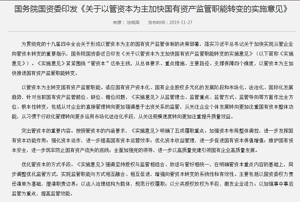 2019年11月7日,為貫徹落實(shí)黨的十九屆四中全會(huì)關(guān)于形成以管資本為主的國(guó)有資產(chǎn)監(jiān)管體制的決策部署,按照黨中央、國(guó)務(wù)院關(guān)于深化國(guó)資國(guó)企改革的有關(guān)要求,國(guó)資委印發(fā)《關(guān)于以管資本為主加快國(guó)有資產(chǎn)監(jiān)管職能轉(zhuǎn)變的實(shí)施意見》(簡(jiǎn)稱《實(shí)施意見》)。11月27日,國(guó)務(wù)院國(guó)資委在京召開政策吹風(fēng)會(huì)時(shí)表示,《實(shí)施意見》是國(guó)資監(jiān)管機(jī)構(gòu)第一次以文件的形式,明確管資本的具體路徑。國(guó)資委將以此次職能轉(zhuǎn)變?yōu)樾缕瘘c(diǎn),按照《實(shí)施意見》明確的方向和路徑,全面落實(shí)各項(xiàng)措施,著力完善以管資本為主的國(guó)有資產(chǎn)監(jiān)管體制,不斷提高監(jiān)管的系統(tǒng)性針對(duì)性有效性,確保管資本重點(diǎn)任務(wù)落實(shí)落地。