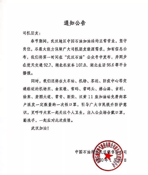 中國(guó)石油:武漢加油站正常營(yíng)業(yè),天然氣供應(yīng)充足,免費(fèi)派發(fā)一次性口罩