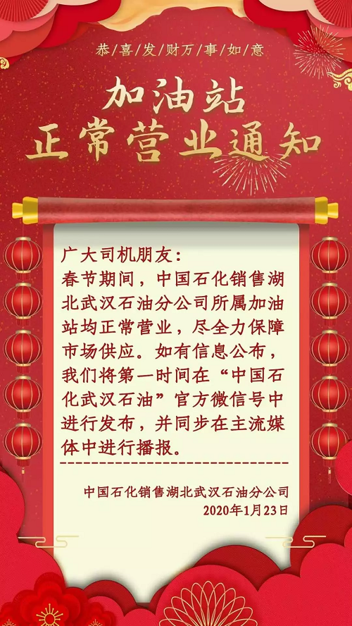 1月23日,中國(guó)石化表示,春節(jié)期間中國(guó)石化銷售湖北武漢石油分公司所屬加油站均正常營(yíng)業(yè),盡全力保障市場(chǎng)供應(yīng)。網(wǎng)傳“斷油”消息不實(shí),市民不必恐慌,不必提前集中到加油站加油。