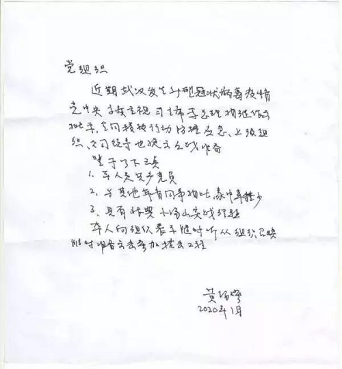 已經(jīng)79歲的黃錫璆第一時(shí)間向組織遞交了請戰(zhàn)書。他寫道:“本人是共產(chǎn)黨員,與其他年青同事相比家中牽掛少,具有非典小湯山實(shí)戰(zhàn)經(jīng)驗(yàn)。本人向組織表示,隨時(shí)聽從組織召喚,隨時(shí)準(zhǔn)備突擊參加抗擊工作。”