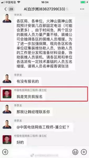 為了保障醫(yī)院固定電話的正常運(yùn)維,武漢電信計(jì)劃從各區(qū)抽調(diào)人員,增強(qiáng)前線保障力量。通知?jiǎng)倓偘l(fā)出,武昌區(qū)分裝維員工潘立虹立即響應(yīng)。“我是黨員我報(bào)名!”