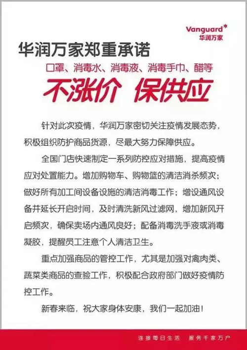華潤集團(tuán)旗下華潤萬家、華潤五豐等在疫情發(fā)生后第一時(shí)間發(fā)布公告,鄭重承諾“不漲價(jià)、保供應(yīng)”。