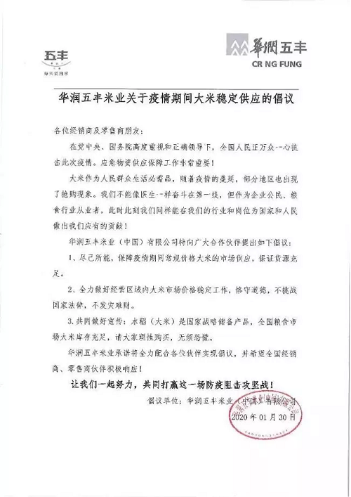 華潤五豐米業(yè)(中國)有限公司發(fā)布倡議,承諾: