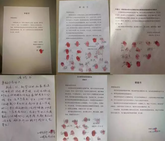 之后,一張張按著紅手印的請戰(zhàn)書紛紛發(fā)到內(nèi)蒙古一機醫(yī)院先鋒黨員群,有的以個人名義請戰(zhàn),有的以支部名義請戰(zhàn)。截至當晚7點半,全院151名醫(yī)務人員主動報名加入“醫(yī)護救援隊”。