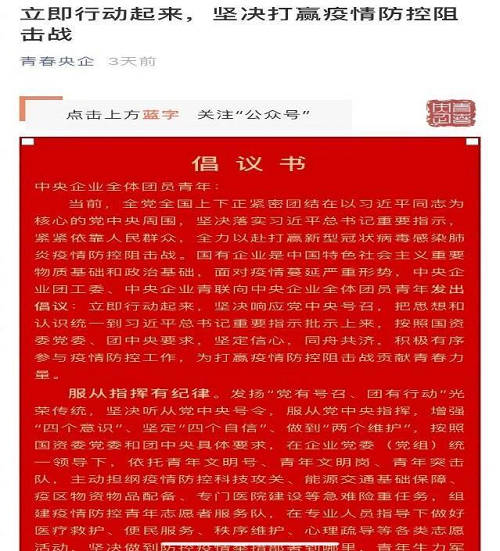 按照國資委黨委部署,1月29日,當(dāng)疫情轉(zhuǎn)入關(guān)鍵攻堅階段,中央企業(yè)團(tuán)工委、中央企業(yè)青聯(lián)發(fā)出《立即行動起來堅決打贏疫情防控阻擊戰(zhàn)——致中央企業(yè)全體團(tuán)員青年倡議書》,“堅定信心,同舟共濟(jì),積極有序參與疫情防控工作,為打贏疫情防控阻擊戰(zhàn)貢獻(xiàn)青春力量”,倡議書吹響央企青年戰(zhàn)“疫”攻堅號角。
