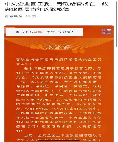 面對來勢洶洶的疫情,中央企業(yè)團(tuán)工委按照國資委黨委要求,迅速行動。1月24日除夕,中央企業(yè)團(tuán)工委、中央企業(yè)青聯(lián)在“青春央企”公眾號第一時間轉(zhuǎn)發(fā)團(tuán)中央《關(guān)于立即行動起來投身新型冠狀病毒感染肺炎疫情防控工作的通知》,發(fā)出《給奮戰(zhàn)在一線央企團(tuán)員青年的致敬信》,傳達(dá)習(xí)近平總書記重要指示批示精神和黨中央決策部署,動員中央企業(yè)各級團(tuán)組織和團(tuán)員青年,按照同級黨組織部署,有序參與防控工作。《致敬信》被“新浪熱門微博”(即熱搜)立即轉(zhuǎn)載。我們立即成立疫情防控工作協(xié)調(diào)小組,建立疫情防控工作群,制動工作方案,細(xì)化任務(wù)分工,形成“每日關(guān)注”工作機(jī)制,暢通信息報送渠道,公布聯(lián)系人及聯(lián)系電話,堅定央企青年打贏疫情防控阻擊戰(zhàn)的信心決心。指導(dǎo)各中央企業(yè)團(tuán)委在企業(yè)黨委統(tǒng)一領(lǐng)導(dǎo)下,積極受領(lǐng)任務(wù),開展工作,形成步調(diào)一致、共同發(fā)力的中央企業(yè)共青團(tuán)疫情防控工作格局。