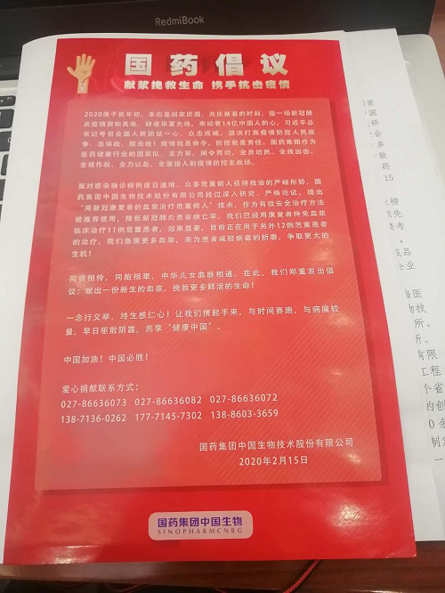 國藥中生2月15日發(fā)出倡議書,倡議新冠肺炎康復(fù)者捐獻(xiàn)血漿,捐獻(xiàn)條件包括“新冠肺炎康復(fù)者年齡在18-60周歲,確診感染過新型冠狀病毒,出院后目前身體狀況較好,沒有其他不適,并愿意捐獻(xiàn)出自己的血漿幫助他人”等內(nèi)容。