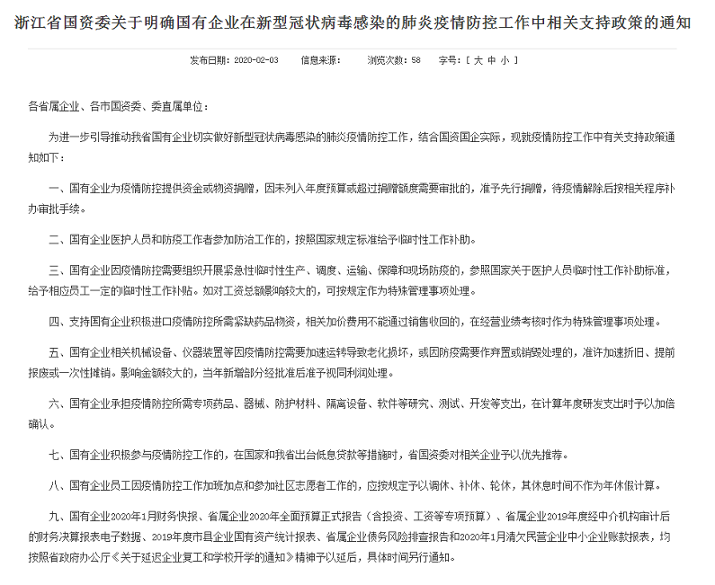 早在2月3日,為進(jìn)一步引導(dǎo)推動(dòng)企業(yè)切實(shí)做好新冠肺炎疫情防控工作,浙江省國(guó)資委印發(fā)《關(guān)于明確國(guó)有企業(yè)在新型冠狀病毒感染的肺炎疫情防控工作中相關(guān)支持政策的通知》,在經(jīng)營(yíng)業(yè)績(jī)考核、捐贈(zèng)審批、工資總額、研發(fā)支出等方面明確了九條措施,對(duì)所監(jiān)管企業(yè)積極參與疫情防控予以大力支持。