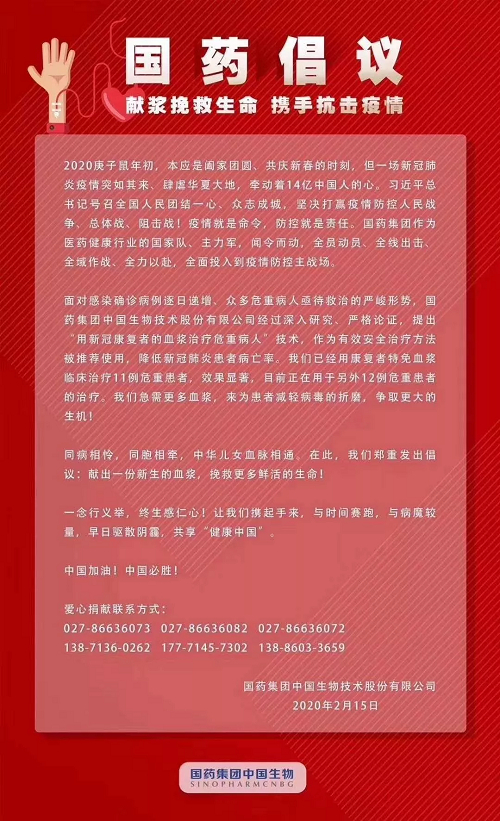 日前,國藥集團(tuán)中國生物稱已完成對部分康復(fù)者血漿的采集工作,開展新冠病毒特免血漿制品和特免球蛋白的制備。經(jīng)過嚴(yán)格的血液生物安全性檢測,病毒滅活,抗病毒活性檢測等,已成功制備出用于臨床治療的特免血漿,在國藥集團(tuán)中國生物武漢生物制品研究所、國藥集團(tuán)武漢血液制品有限公司、武漢市江夏區(qū)第一人民醫(yī)院、武漢血液中心、中科院武漢病毒研究所、中國食品藥品檢定研究院的緊密合作下,投入臨床救治重癥患者。對此,醫(yī)藥地理聯(lián)系了中國生物相關(guān)負(fù)責(zé)人,對康復(fù)者血漿治療的焦點問題進(jìn)行了專訪。