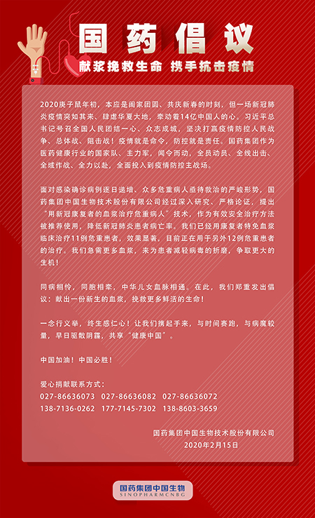 為了挽救更多鮮活生命,為患者爭取更大的生機,國藥集團中國生物向新冠肺炎康復者鄭重發(fā)出倡議: