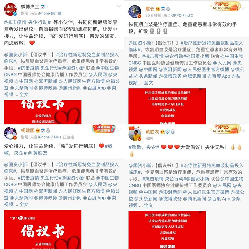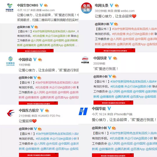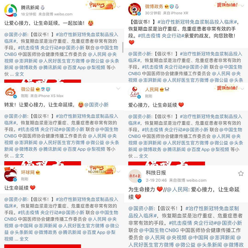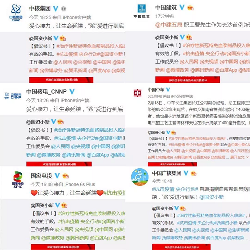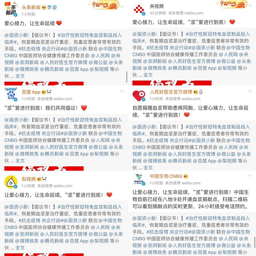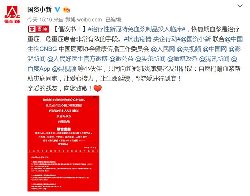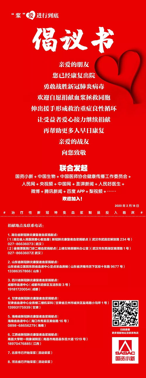 2月18日起,@國資小新 聯(lián)合中國生物、中國醫(yī)師協(xié)會(huì)健康傳播工作委員會(huì)、人民網(wǎng)、央視頻、中國網(wǎng)、澎湃新聞、人民好醫(yī)生官方微博、微公益、頭條新聞、微博政務(wù)、騰訊新聞、百度App、梨視頻等小伙伴,共同向新冠肺炎康復(fù)者發(fā)起愛心接力捐贈(zèng)血漿微倡議:懇請新冠肺炎康復(fù)者朋友獻(xiàn)出愛心,自愿捐獻(xiàn)血漿幫助患病同胞,讓愛心接力,讓生命延續(xù),“漿”愛進(jìn)行到底!