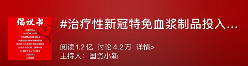 2月13日晚上,中國生物宣布其研制的治療性新冠特免血漿制品投入臨床,救治重癥患者。