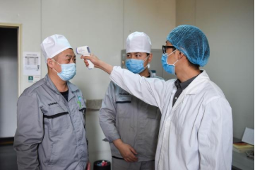 新華社照片,烏魯木齊,2020年2月22日 新疆烏魯木齊:防疫不松勁 復(fù)工干勁足 2月22日,在國(guó)藥集團(tuán)新疆制藥有限公司,工作人員在測(cè)量體溫。 連日來(lái),新疆烏魯木齊部分企業(yè)在確保做好防疫工作的前提下,安全有序復(fù)工,復(fù)工企業(yè)主要以電力、熱力、食品、化工企業(yè)等急需物資重點(diǎn)企業(yè)以及生活保障企業(yè)為主。 新華社記者 丁磊 攝