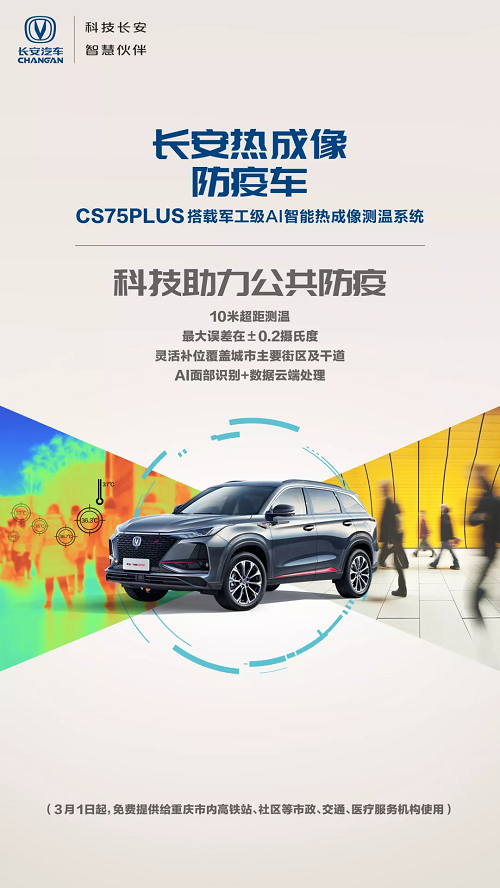自3月1日起,長安CS75 Plus防疫車將免費提供給重慶室內(nèi)高鐵站、社區(qū)等市政、交通、醫(yī)療服務(wù)機構(gòu)使用。