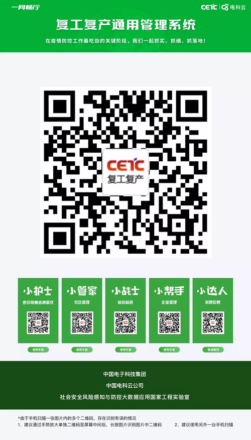 2月20日,中國電科正式發(fā)布“一網(wǎng)暢行——復工復產(chǎn)通用管理系統(tǒng)”,并面向公眾開放使用。該系統(tǒng)由一個風險人群感知大數(shù)據(jù)中心、一個智能指揮平臺、五個APP應(yīng)用組成(1+1+5),具有數(shù)據(jù)權(quán)威、精準評估、體系聯(lián)動、有效管控四大特點。各級政府及企事業(yè)單位可通過互聯(lián)網(wǎng)掃碼下載,既可單獨使用,又可組合成管理體系,進而實現(xiàn)精確管控。