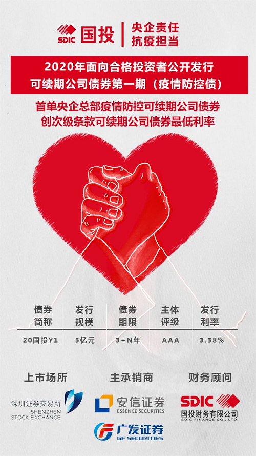 2020年2月18日,國家開發(fā)投資集團有限公司于深交所成功發(fā)行國內(nèi)資本市場首單央企總部疫情防控可續(xù)期公司債券,發(fā)行規(guī)模5億元,發(fā)行利率3.38%,期限3+N年,募集資金將優(yōu)先用于支持防疫相關(guān)成員企業(yè)開展防疫物資生產(chǎn)活動。