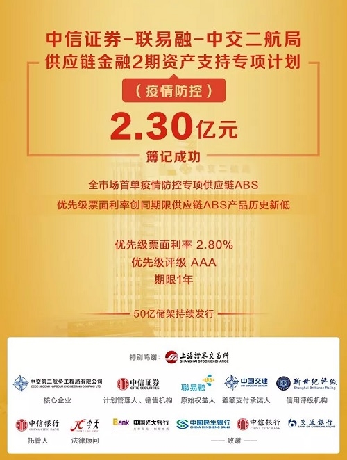 2月14日,中交集團所屬二航局在上交所簿記發(fā)行全市場首單疫情防控資產(chǎn)支持證券(ABS),發(fā)行規(guī)模2.3億元,期限1年,優(yōu)先級票面利率2.8%,7天完成發(fā)行,發(fā)行效率創(chuàng)供應(yīng)鏈金融ABS產(chǎn)品歷史新高。