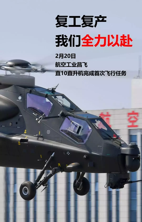 2月20日,航空工業(yè)昌飛完成復工復產(chǎn)后5架武裝直升機的第一飛。