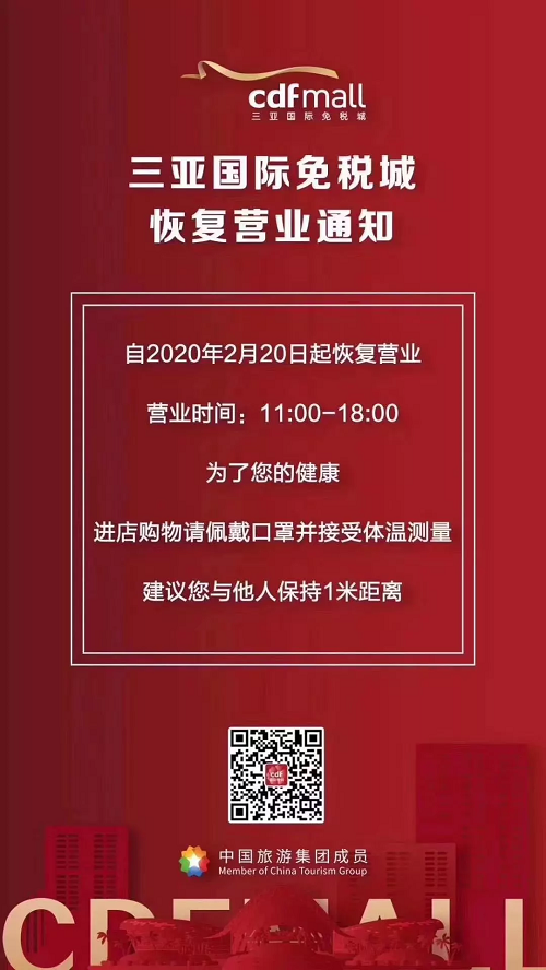 自2月20日起,中國旅游集團三亞國際免稅城一期及二期開始恢復營業(yè),營業(yè)時間為11:00-18:00,全方位為顧客提供舒適、安心、安全的購物環(huán)境。