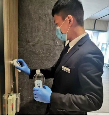 華僑城(物業(yè))集團(tuán)有限公司深圳龍華分公司護(hù)管隊(duì)長張博在給電梯消毒。