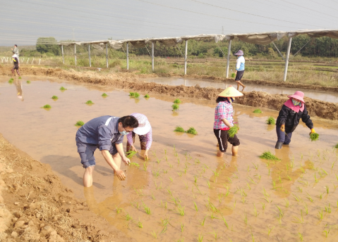 南方電網(wǎng)海南電網(wǎng)公司派駐的“80后”駐村第一書記、白沙黎族自治縣榮邦鄉(xiāng)光村鄉(xiāng)村振興工作隊隊長劉志鵬(左一)和村民熱火朝天地忙著水稻插秧。