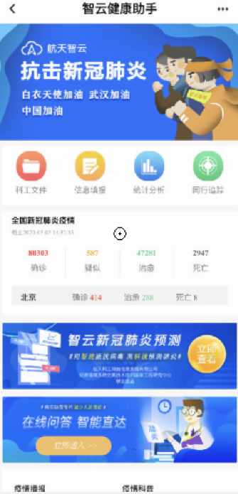 中國航天科工二院網(wǎng)信公司發(fā)揮大數(shù)據(jù)及人工智能技術(shù)優(yōu)勢(shì),開發(fā)智云健康助手,為復(fù)工復(fù)產(chǎn)提供信息捕獲、數(shù)據(jù)支撐、輔助決策和態(tài)勢(shì)監(jiān)控等技術(shù)支撐,AI+數(shù)據(jù),云上助力疫情防控和應(yīng)急管理。智云健康助手通過二維碼掃描填報(bào),頁面簡(jiǎn)潔、操作便捷,具備疫情信息查詢、疫情信息填報(bào)、醫(yī)療服務(wù)對(duì)接、政策文件共享等功能,其中疫情信息填報(bào)可實(shí)現(xiàn)“出行記錄、健康日?qǐng)?bào)、體溫監(jiān)控、隔離情況”等常用信息一鍵提交、自動(dòng)統(tǒng)計(jì)。后臺(tái)數(shù)據(jù)實(shí)時(shí)智能分析、可視化展示,加強(qiáng)了對(duì)企業(yè)復(fù)工復(fù)產(chǎn)期間的趨勢(shì)分析和疫情預(yù)警,讓數(shù)據(jù)的變化實(shí)時(shí)顯示,快速精準(zhǔn)“阻擊”疫情蔓延,為抗擊疫情、復(fù)工復(fù)產(chǎn)提供智能分析。目前,智云健康助手已在北京市豐臺(tái)區(qū)委區(qū)政府等政府機(jī)構(gòu),二院、湖南航天等多家單位推廣應(yīng)用。