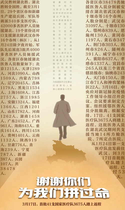 隨著疫情防控形勢的逐漸好轉(zhuǎn),完成醫(yī)療救助任務的來自全國42322名醫(yī)護人員,將陸續(xù)分批離開武漢。今天,3月17日,41支國家醫(yī)療隊3675人踏上返程。