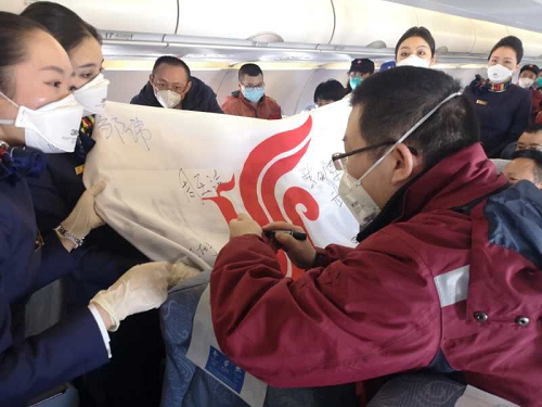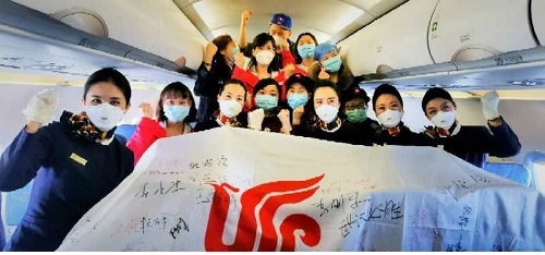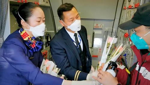 3月17日,國航派出2架包機飛赴武漢,護送白衣天使回家。CA044航班、CA042航班先后于北京時間17時10分和17時49分安抵成都。