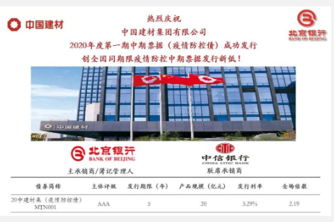 中國(guó)建材連續(xù)發(fā)行三期共計(jì)45億元疫情防控債。2月27日,中國(guó)建材集團(tuán)所屬中國(guó)建材股份有限公司發(fā)行10億元可續(xù)期公司債券(疫情防控債),期限5+N年,票面利率3.65%。3月5日,中國(guó)建材集團(tuán)所屬中國(guó)建材股份有限公司再次發(fā)行了15億元疫情防控公司債券,5年期,票面利率3.18%。3月9日,中國(guó)建材集團(tuán)2020年第一期中期票據(jù)(疫情防控債)成功發(fā)行,金額20億元,期限5年,票面利率3.29%。