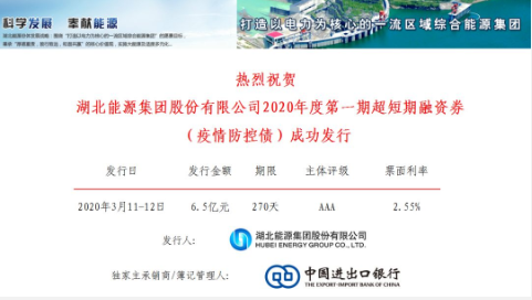 三峽集團(tuán)湖北能源于3月13日在中國(guó)銀行間債券市場(chǎng)成功發(fā)行超短期融資券(疫情防控債),由中國(guó)進(jìn)出口銀行以免除全部承銷手續(xù)費(fèi)的方式承銷,募集資金6.5億元,債券期限270天,票面利率2.55%,全力支援湖北省疫情防控和民生保障,有效保障能源穩(wěn)定供應(yīng)。