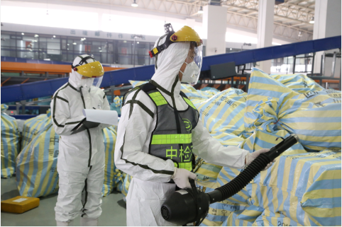 中檢集團(tuán)技術(shù)人員對(duì)出境郵包進(jìn)行預(yù)防性消毒處理。