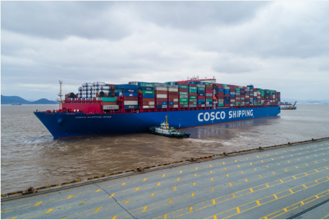 兩萬(wàn)箱超大型集裝箱船“中遠(yuǎn)海運(yùn)白羊座”輪正駛離寧波港。