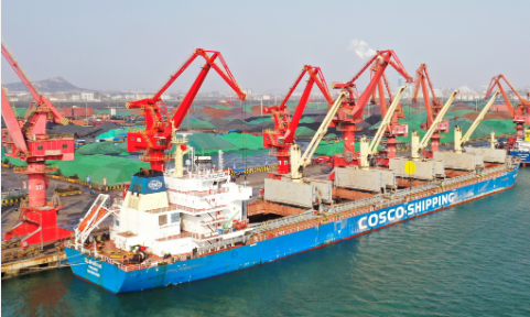 中遠(yuǎn)海運(yùn)衢山海輪55000噸幾內(nèi)亞鋁土礦在日照港卸貨。