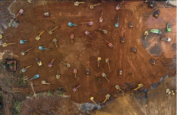 醫(yī)院建設(shè)初期一張經(jīng)典航拍圖,眾多挖掘設(shè)備在奮力施工