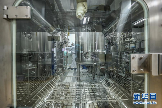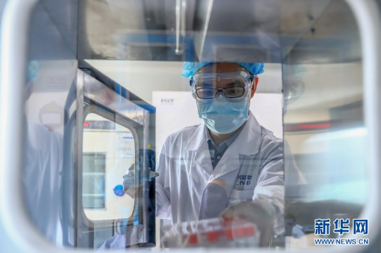 4月11日,工作人員在國(guó)藥集團(tuán)中國(guó)生物新冠疫苗生產(chǎn)基地質(zhì)量檢定部門從傳遞窗拿取新型冠狀病毒滅活疫苗樣品。新華社記者 張玉薇 攝