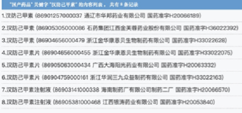 相較而言,漢防己甲素生產(chǎn)企業(yè)較多。從國(guó)家藥監(jiān)局官網(wǎng)查詢到的數(shù)據(jù)顯示,漢防己甲素涉及8個(gè)批文,分別為康恩貝生物制藥2個(gè)、石藥集團(tuán)江西金芙蓉藥業(yè)、通遼市華邦藥業(yè)、廣西大海陽(yáng)光藥業(yè)、浙江華潤(rùn)三九眾益制藥、海南制藥、江西銀濤藥業(yè)各1個(gè)。
