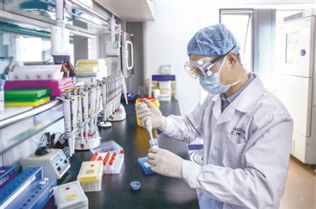 4月11日,工作人員在國藥集團(tuán)中國生物新冠滅活疫苗生產(chǎn)基地質(zhì)量檢定部門對新冠病毒滅活疫苗樣品進(jìn)行雜質(zhì)檢測。新華社記者 張玉薇 攝