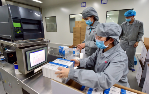 Employees pack Lianhuaqingwen capsules at a Shijiazhuang Yiling Pharmaceutical facility in Shijiazhuang, capital of Hebei province, on Jan 30. [Photo/Xinhua]