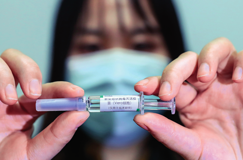 ▲ 4月10日,工作人員在國(guó)藥集團(tuán)中國(guó)生物新冠疫苗生產(chǎn)基地展示新冠病毒滅活疫苗樣品 張玉薇攝/本刊