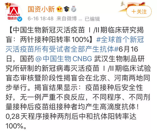 由國(guó)藥集團(tuán)中國(guó)生物武漢生物制品研究所研制的全球首款新冠病毒滅活疫苗Ⅰ/Ⅱ期臨床試驗(yàn)盲態(tài)審核暨階段性揭盲會(huì),16日在北京、河南兩地同步舉行。