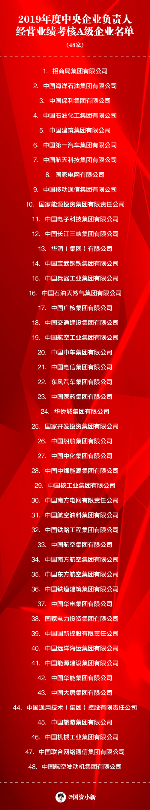 根據(jù)《中央企業(yè)負(fù)責(zé)人經(jīng)營業(yè)績考核辦法》,2019年度中央企業(yè)負(fù)責(zé)人經(jīng)營業(yè)績考核結(jié)果已經(jīng)國資委黨委會議審議通過,現(xiàn)將A級企業(yè)名單通報(bào)如下: