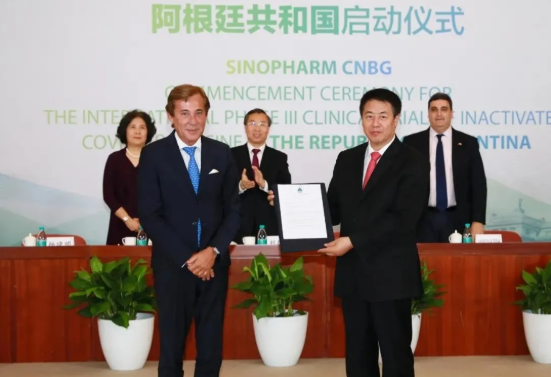 阿根廷駐中國大使克萊科勒爾代表阿根廷政府向國藥集團(tuán)中國生物頒發(fā)了Ⅲ期臨床試驗(yàn)批件