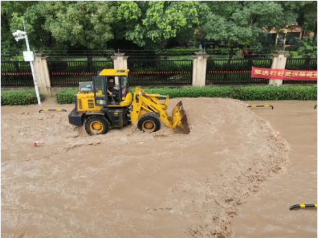 ▲使用推土機(jī)將道路積水推至附近排污井口