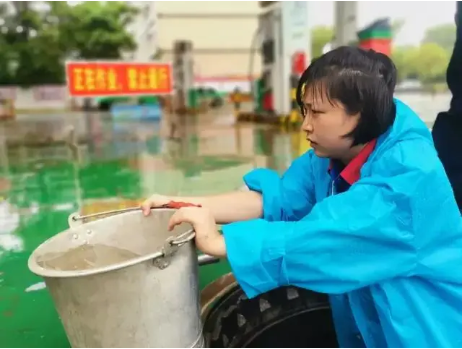 ▲江西九江石油潯陽樓加油站當(dāng)班員工陳露憑借嬌小的身軀下到井內(nèi),徒手舀水30余桶。經(jīng)過干部員工近4個小時的奮戰(zhàn),加油站停業(yè)15小時后,恢復(fù)營業(yè)