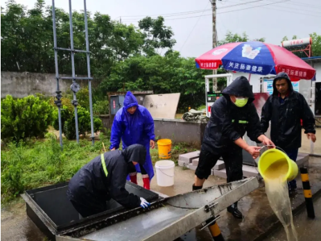 ▲7月6日,武漢石油江夏分公司五里界加油站遭受洪水倒灌浸泡,黨員突擊隊立即趕往現(xiàn)場幫扶,清理操作井積水
