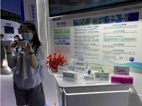 在展區(qū)中,國(guó)藥集團(tuán)中國(guó)生物展示了新冠滅活疫苗、特異性免疫球蛋白、核酸檢測(cè)試劑盒等抗疫“明星”實(shí)物。