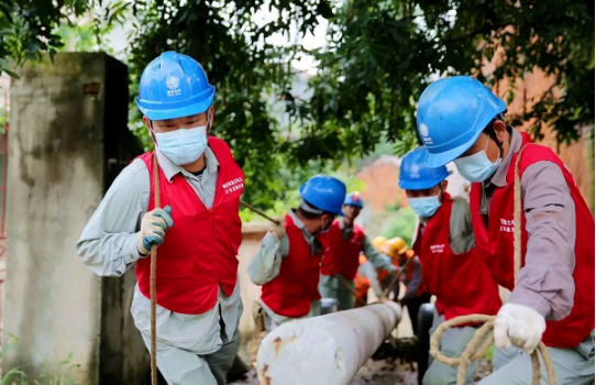國網(wǎng)湖北鄂州華容供電公司共產(chǎn)黨員服務(wù)隊隊員在馬橋村五組低壓臺區(qū)改造現(xiàn)場奮戰(zhàn)。