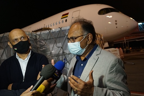 當(dāng)?shù)貢r間7月4日晚,第三批中國國藥新冠疫苗運抵毛里求斯西沃薩古爾·拉姆古蘭爵士國際機(jī)場。毛外交部長艾倫·加努、衛(wèi)生部長賈古特帕爾親自前往機(jī)場迎接。